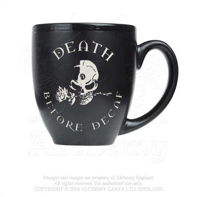 Share your passion for caffine! With this substantial, high quality drinking mug engraved with this fun meme 'Death Before Decaf'!